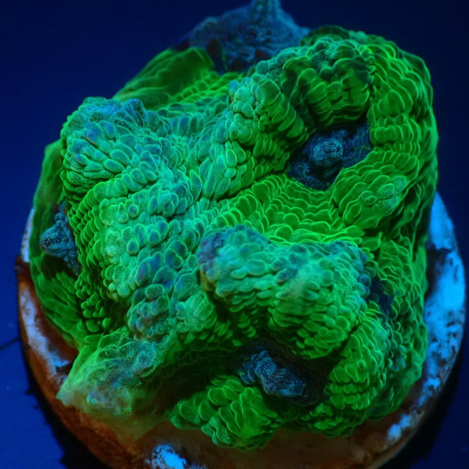 平べったい形で光を良く受けて、がっつり蛍光に光る姿がとても妖艶なサンゴだね