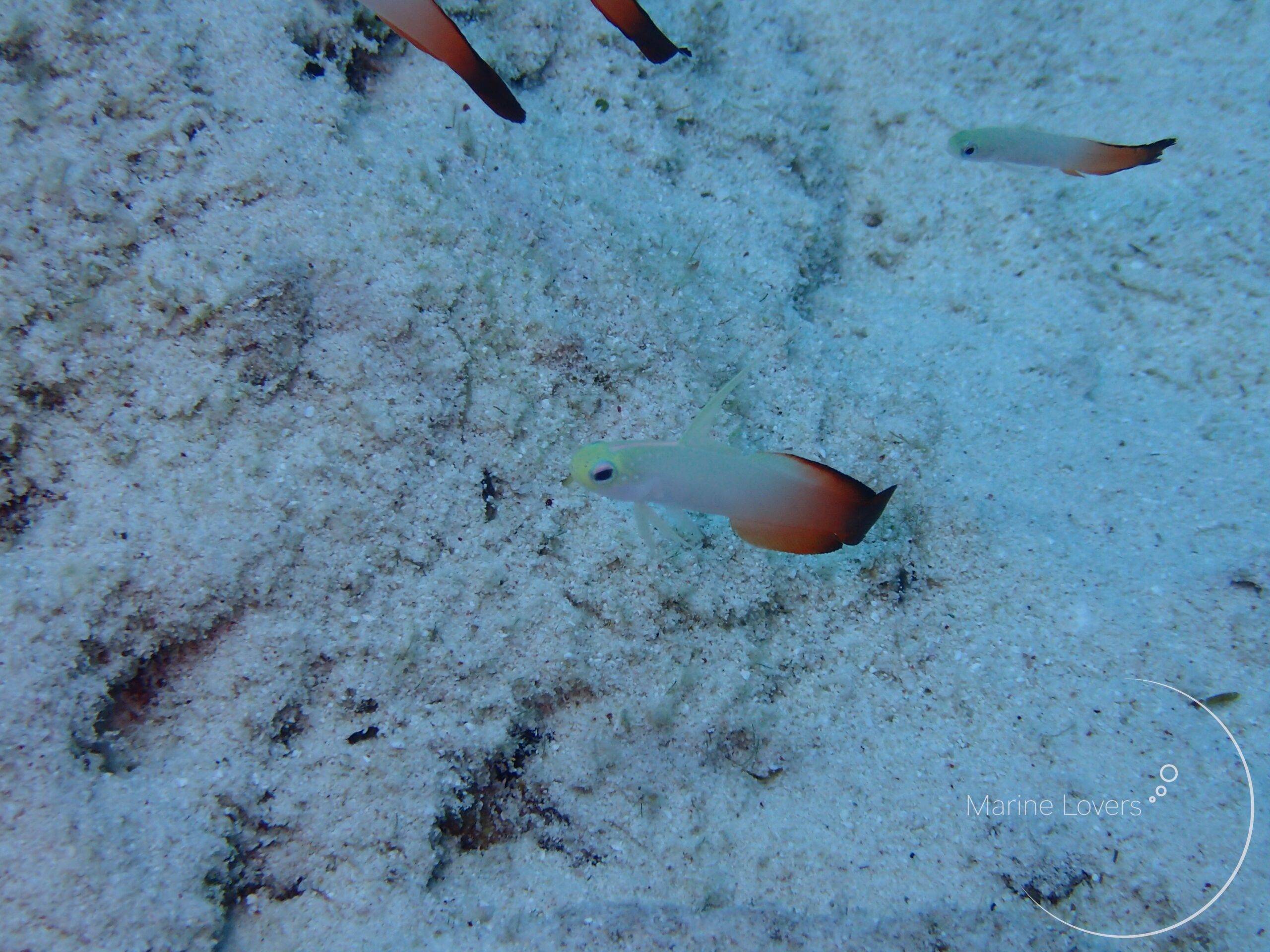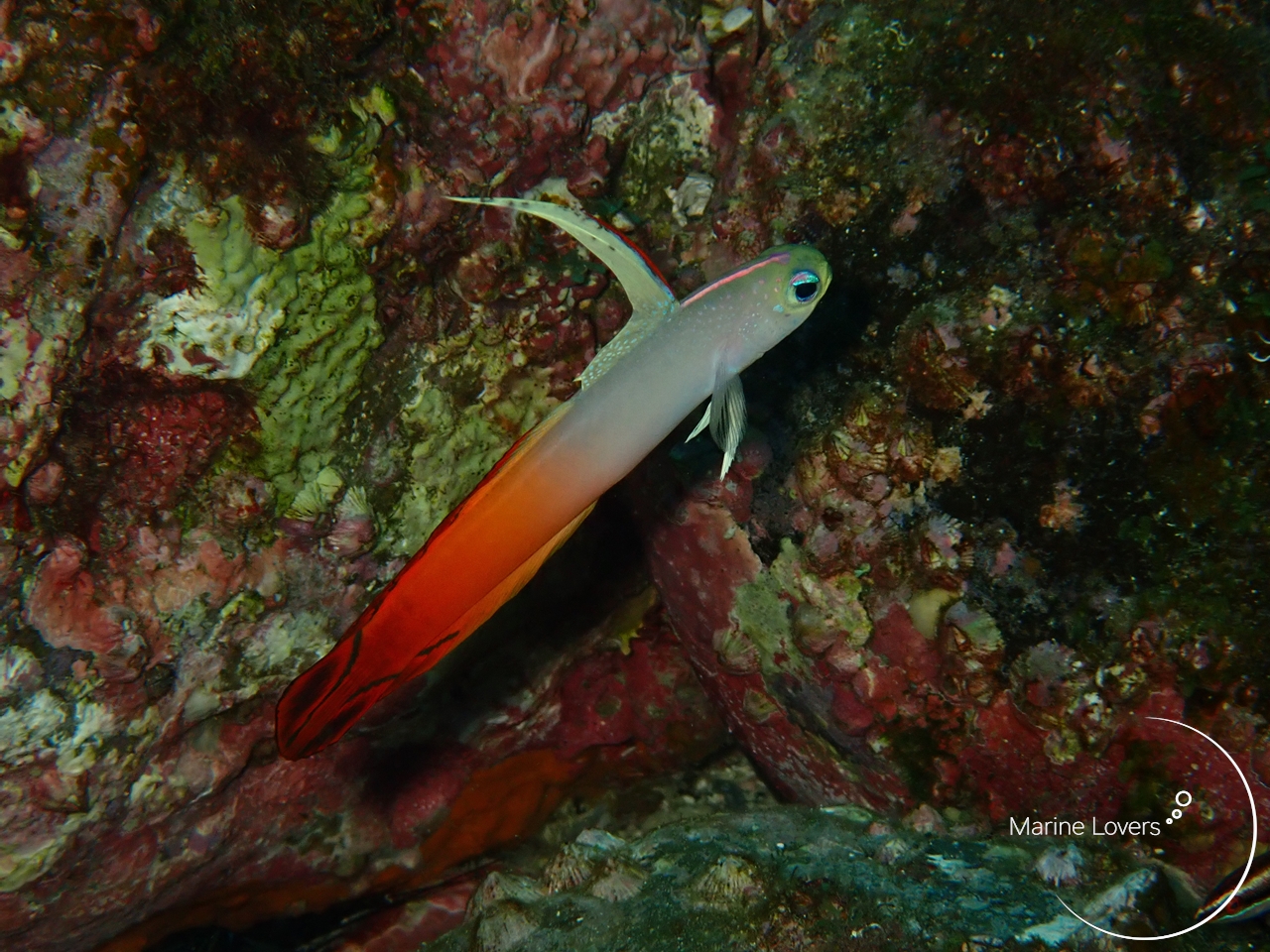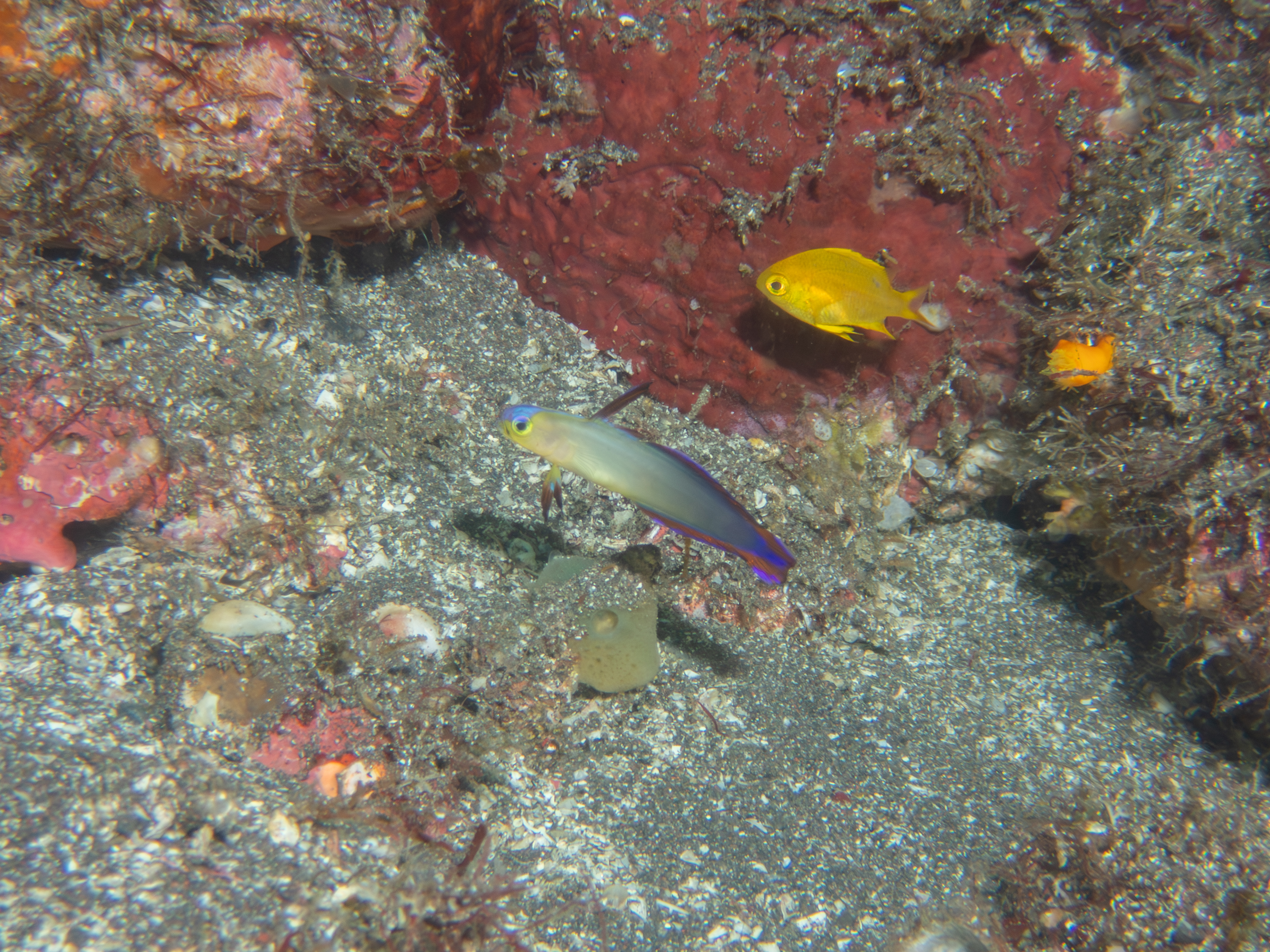 水深20~50mの潮通しの良い岩礁・サンゴ礁斜面を好むため、ハタタテハゼよりも観察が難しいです。