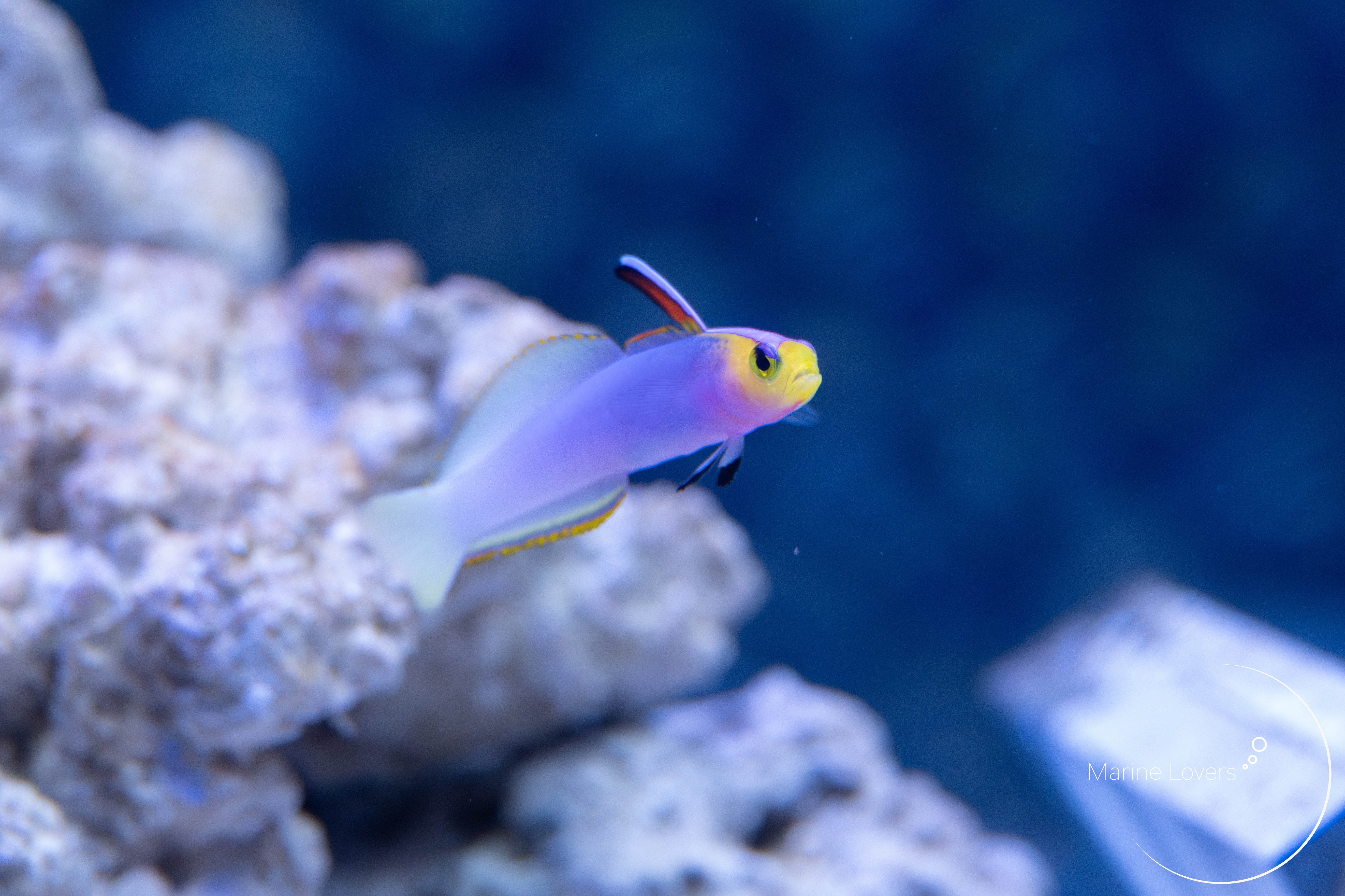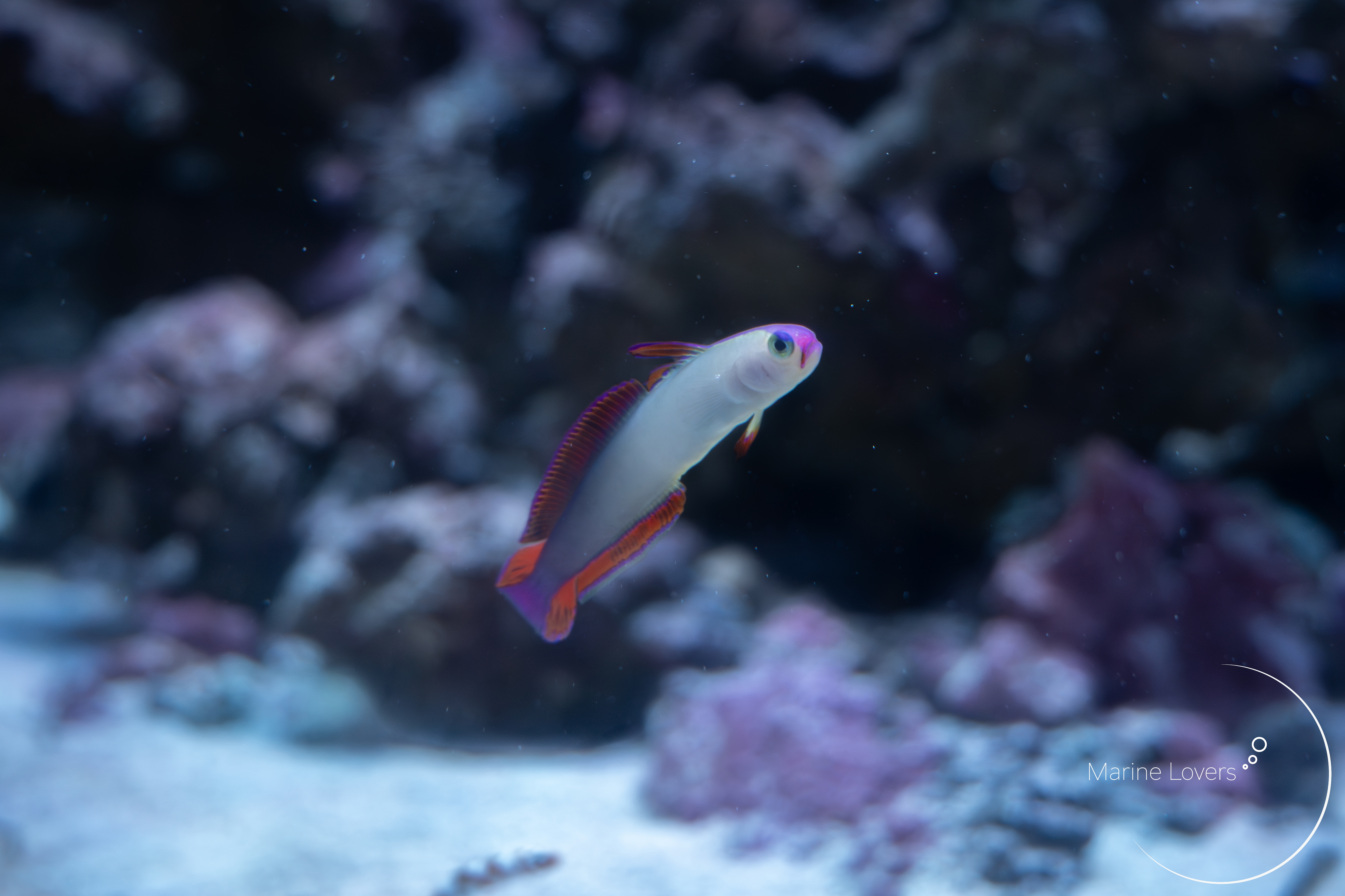 「シコンハタタテハゼ」はハタタテハゼ属の中でも最もレアな種で、体全体の薄紫がとても上品で美しい見た目です。