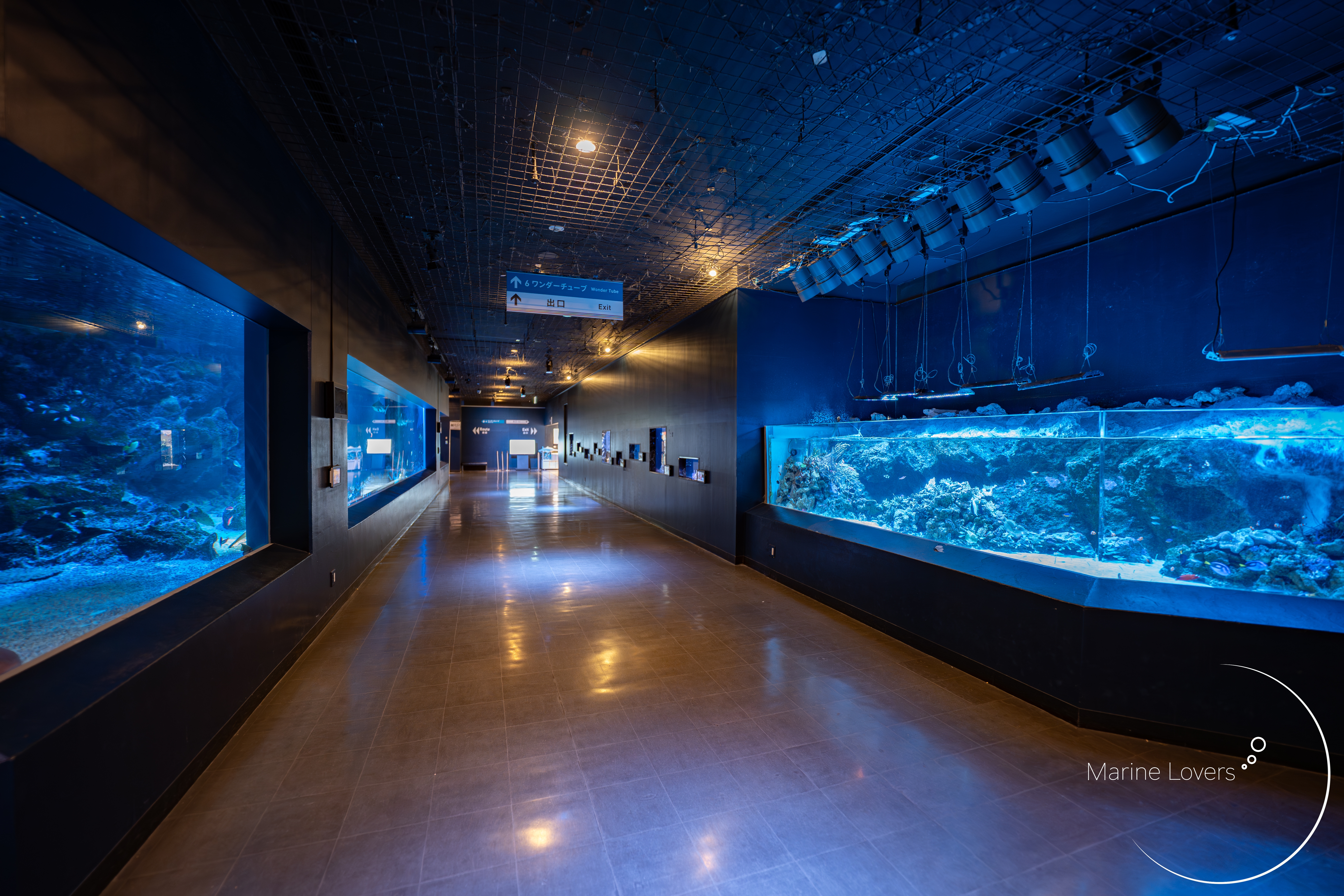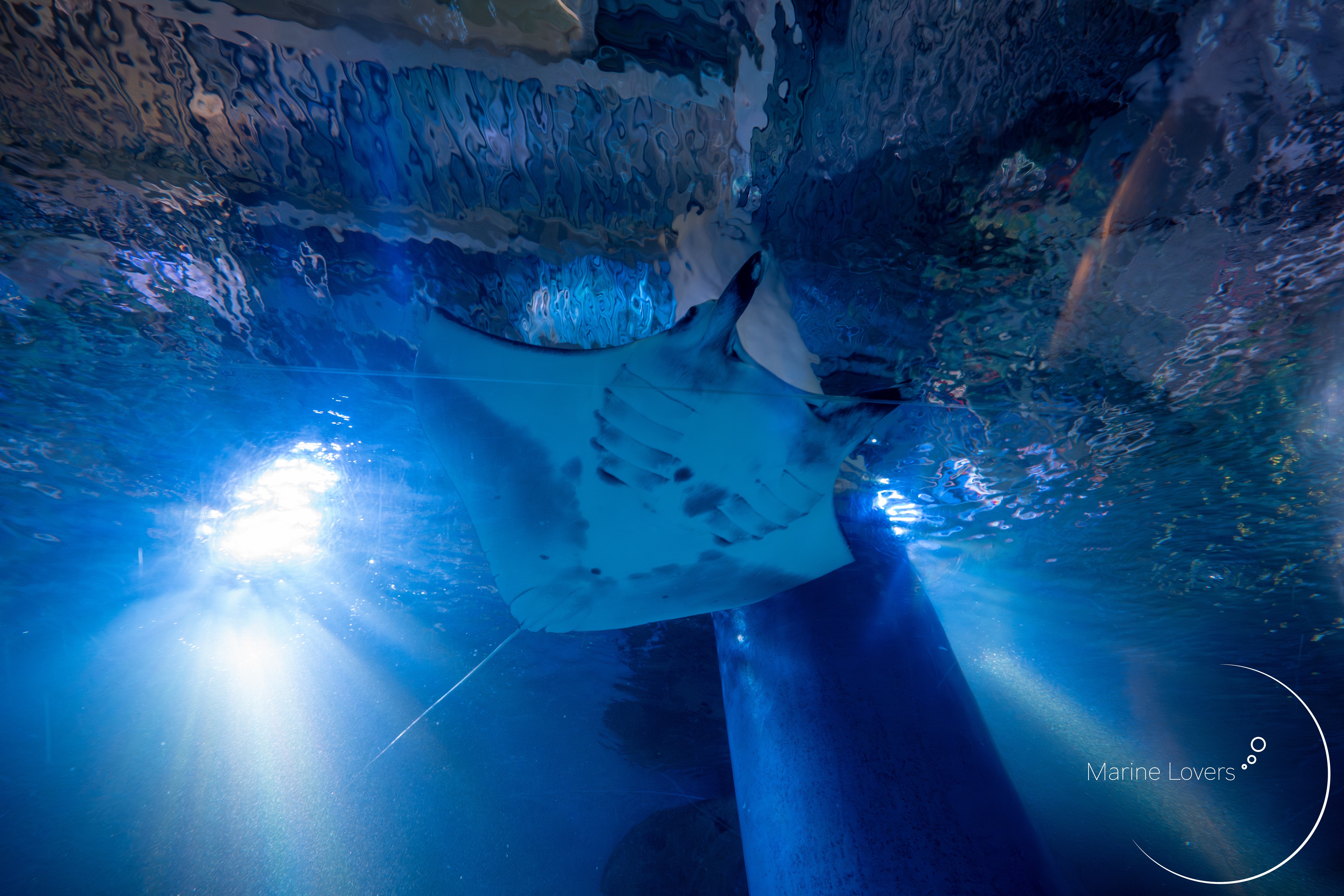 作例では14mmの単焦点を使用していますが、トンネルという水族館の構造を映しこみつつ、巨大なマンタの全身を収めることができています。