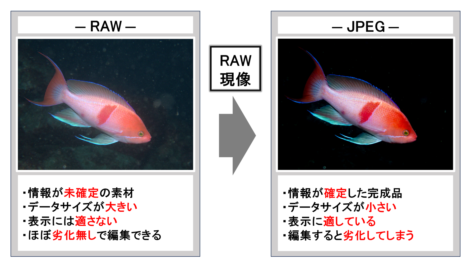 したがって、自分で自由な編集をするには撮影後に画質の劣化覚悟で行わなければなりません。つまりJPEGで「理想の1枚」を仕上げるには、全ての設定をその瞬間に水中で行わなければならないのです。
