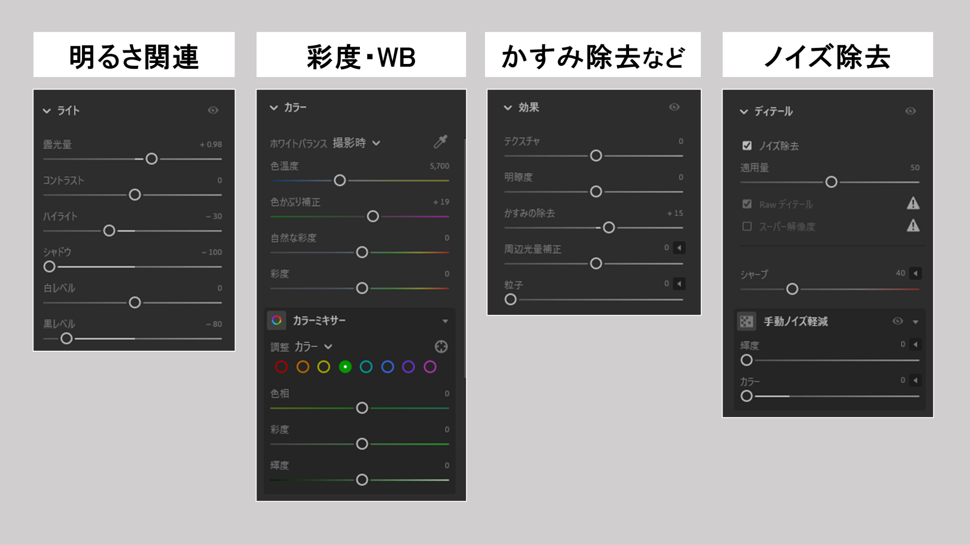 これらのパラメータを調整することで、写真を見やすくきれいに整えたり、色を補正したりすることができるのです。