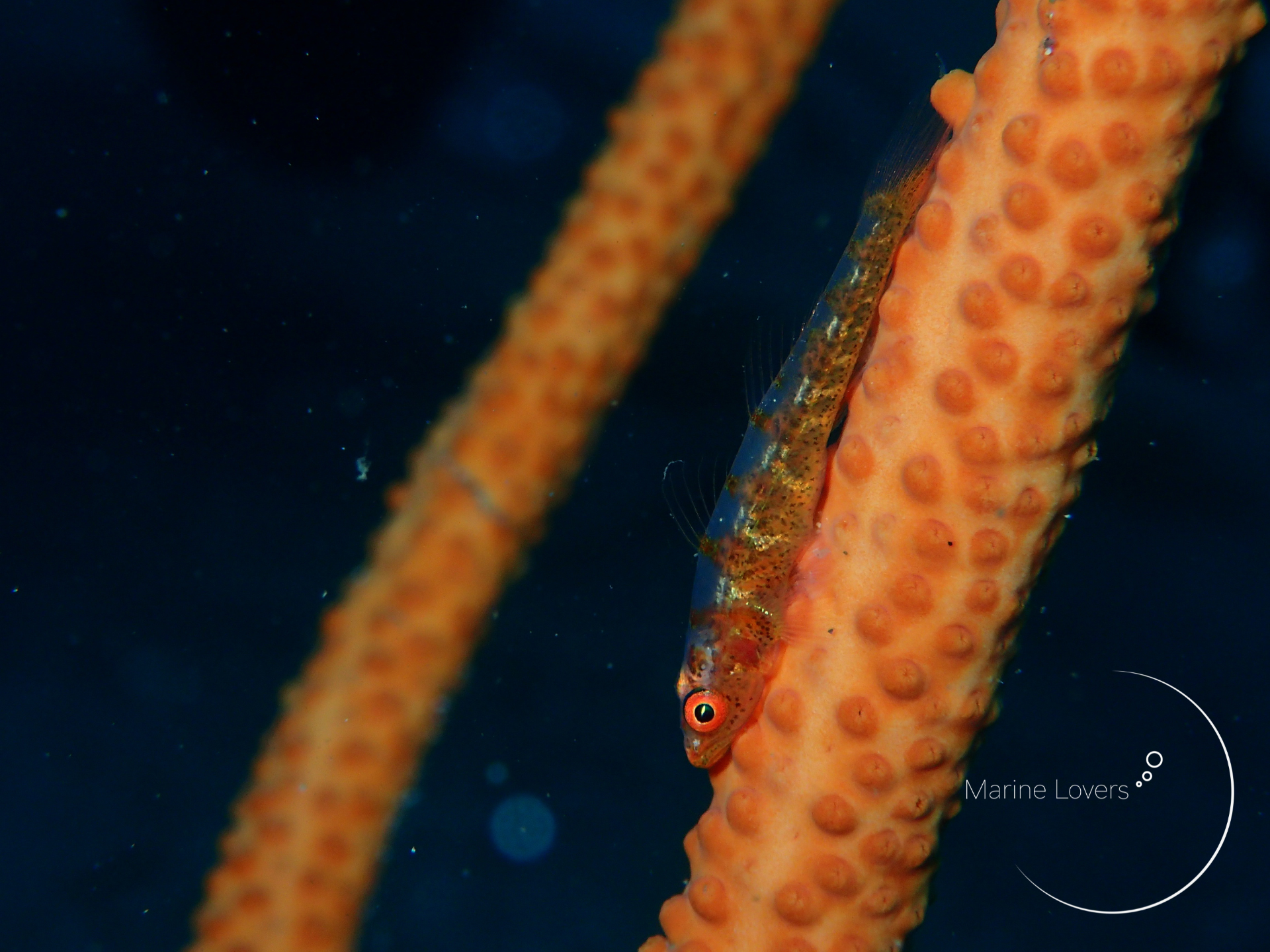 ガラスハゼ」はムチカラマツをホストとして住むハゼで、英名はWhip coral goby。Whip coralはムチカラマツのこと、gobyはハゼのことなので、なんと英名をそのまま訳すと「ムチカラマツハゼ」になります。