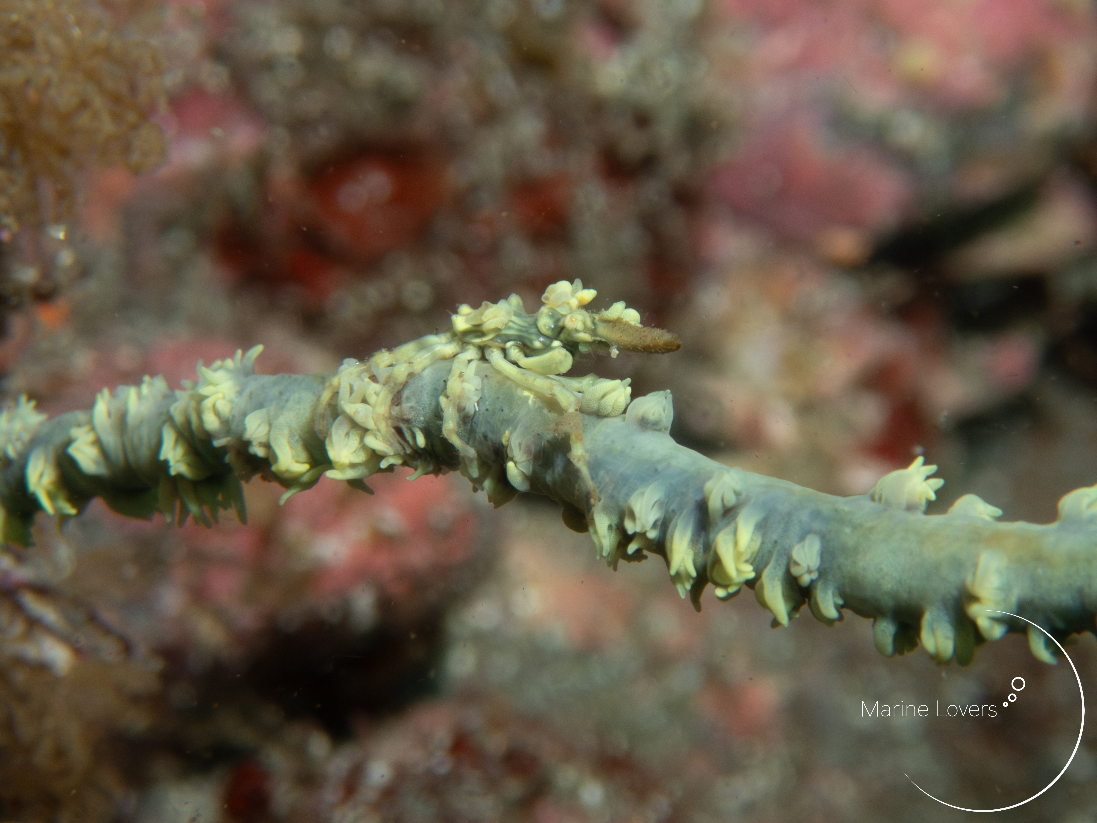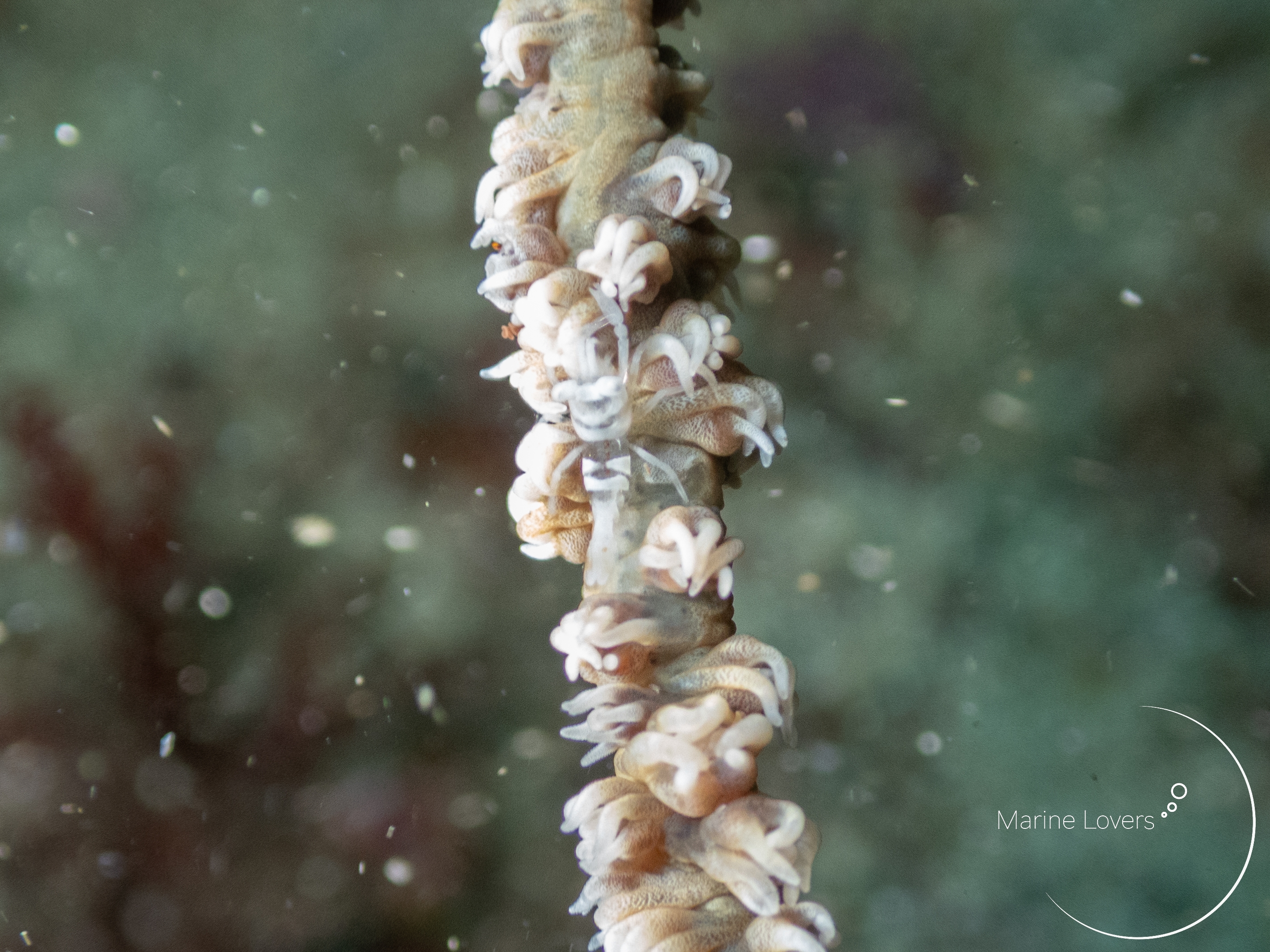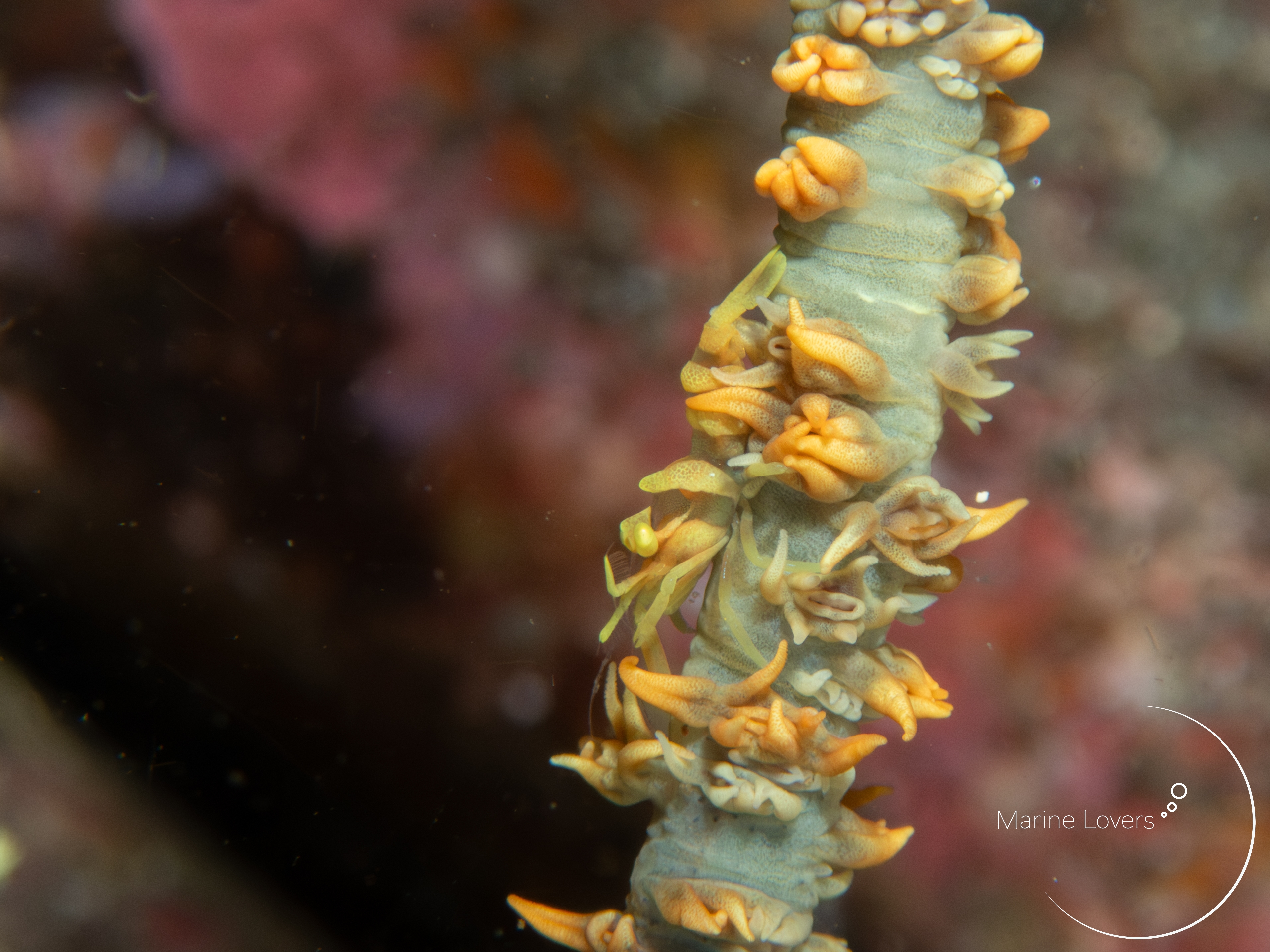 ムチカラマツの群体上には様々な生きものが住み着いている
