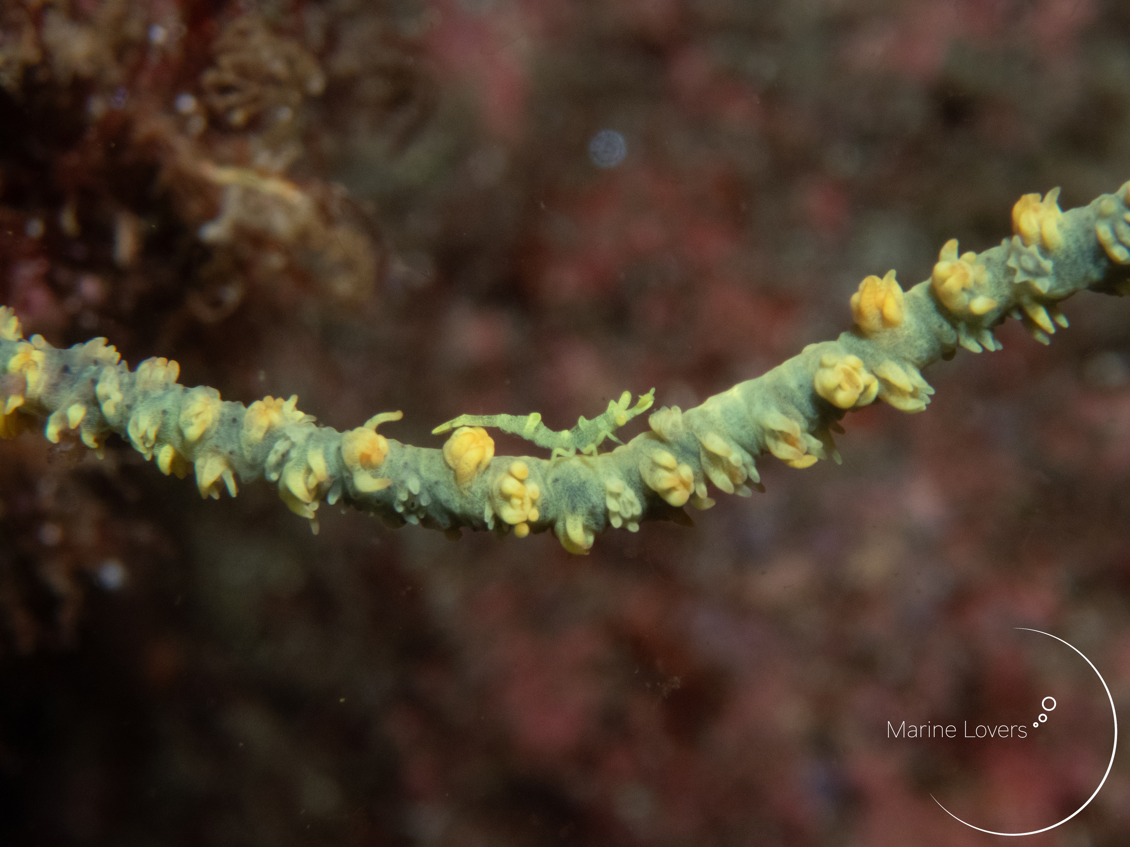 ウミカラマツエビ」はその名の通りウミカラマツによく住んでいるエビなのですが、先日のダイビングでムチカラマツに住んでいる姿を見つけました。